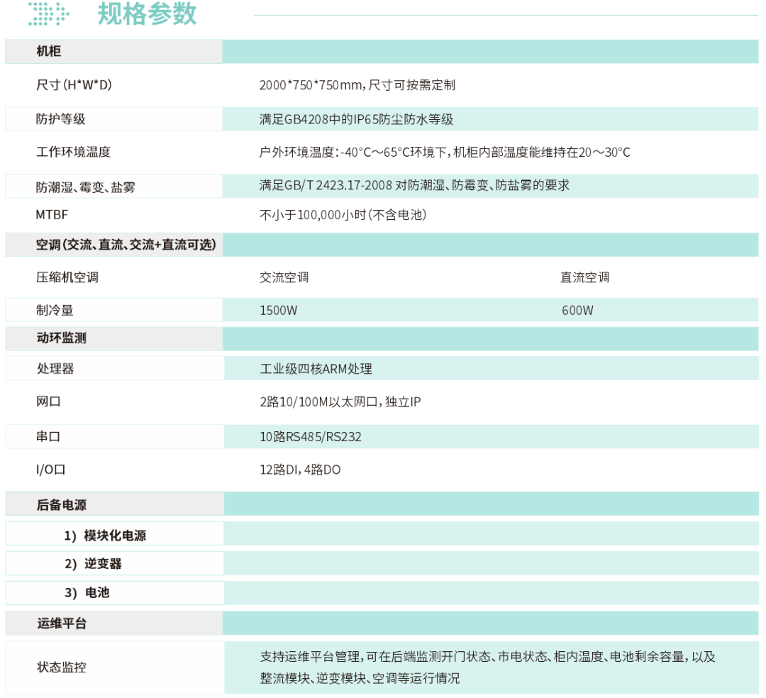 OTS-SIC-D系列户外一体化机柜具有支持AC 90~300V超宽电压输入;AC 220V±5%的N+1冗余保护输出等特点。