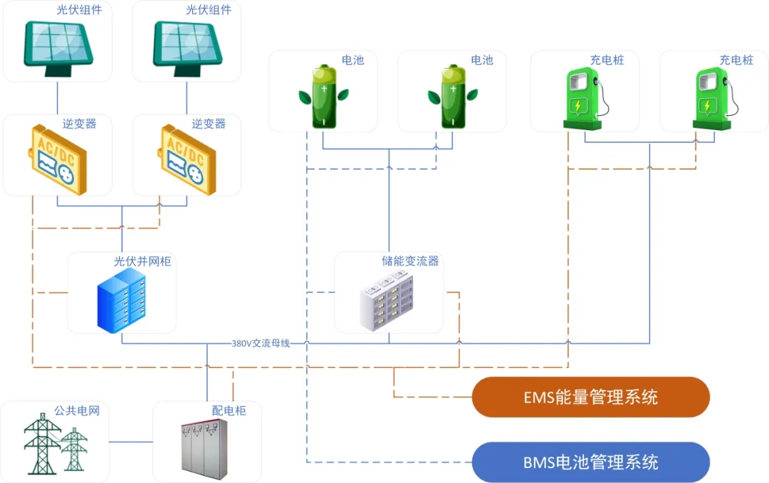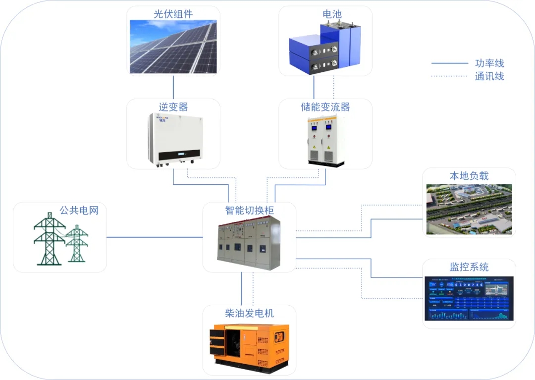 光伏发电阵列、光伏逆变器、储能PCS集成系统、新能源汽车充电桩及场区负荷、公共电网、柴油发电机等组成。