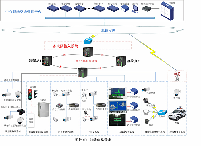 - 单个监控点采用MIS多业务交换机,实现多业务多传输媒介下的多协议、多接口标准的并行接入,有效简化系统构成;